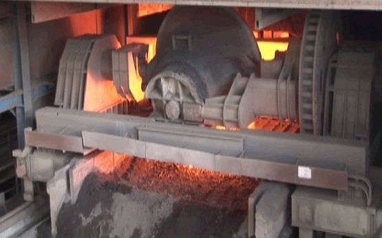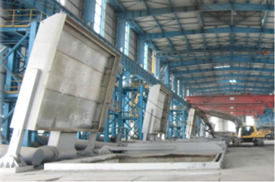 傾翻機構(gòu)將約1600℃熔融鋼渣送入熱破碎間。